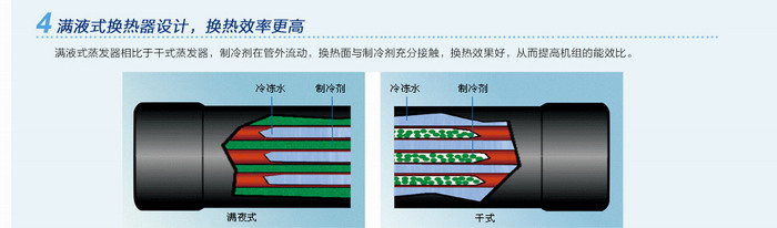 滿液式蒸發器相比于干式蒸發器,制冷劑在管外流動,換熱面與制冷劑充分接觸,換熱效果好,從而提高機組的能效比。