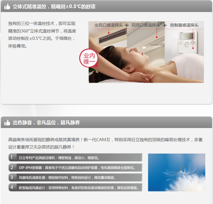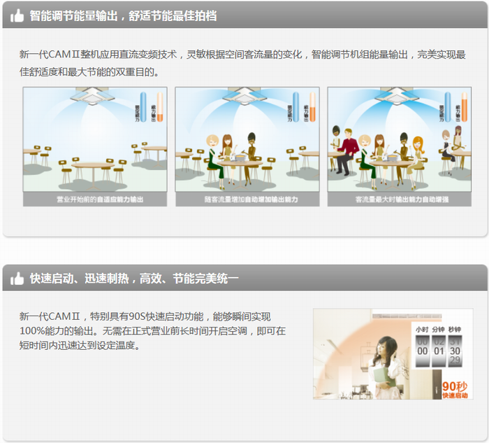 時代新生,為夢想而來。日立懂得高端商業空間的高品質、高舒適度的新生要求,專為中小型商鋪開發新一代CAMⅡ商用中央空調(Commercial Advanced Multi Air-condition)。通過日立優越的多聯機先進技術,以豐富多彩的室內機產品形式、多種人性智能化設計、多項領先的節能技術以及智能強大的控制系統,全方位實現中小型商用空間對環境時尚舒適、高效節能等高品質夢想。CAMⅡ 變頻多聯機系列產品特點: